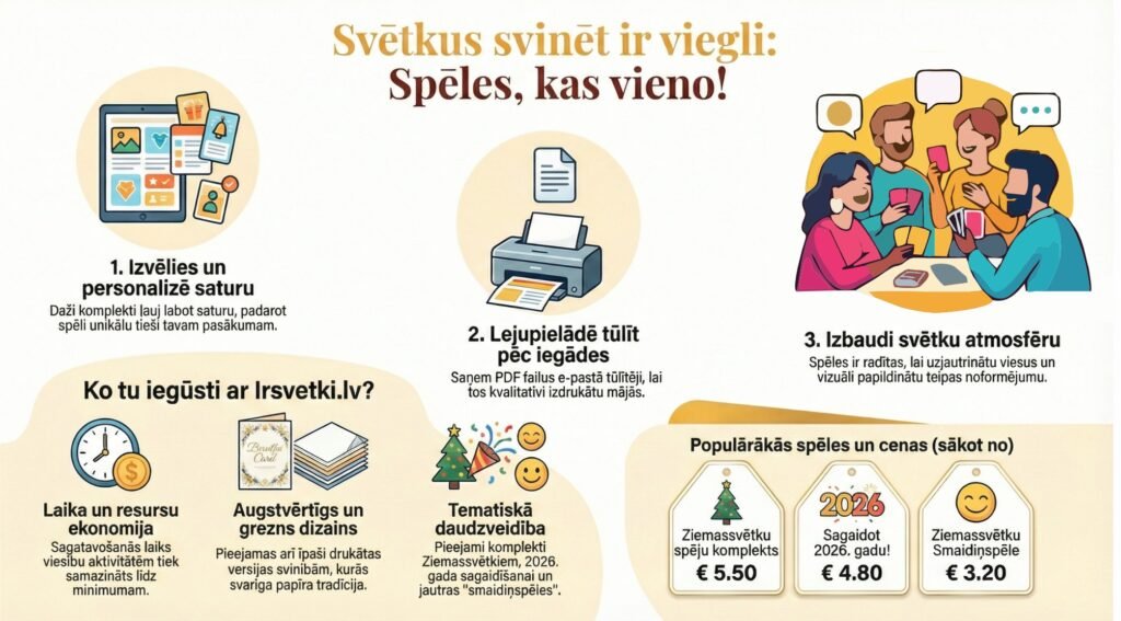 Mūsdienīgas viesību spēles no #Irsvētki. Ja vēlies kaut ko vairāk par klasiku, Irsvētki.lv piedāvā mūsdienīgas ballīšu spēles ar pārdomātiem jautājumiem un stilīgu dizainu. 🃏 Gatavas jautājumu kartītes. 🎯 Viss ir sagatavots – atliek tikai atvērt iepakojumu vai lejupiepielādēt gatavos dizainus un sākt spēli. 👉 Apskati Irsvētki.lv viesību spēļu klāstu un izvēlies saviem svētkiem piemērotāko!